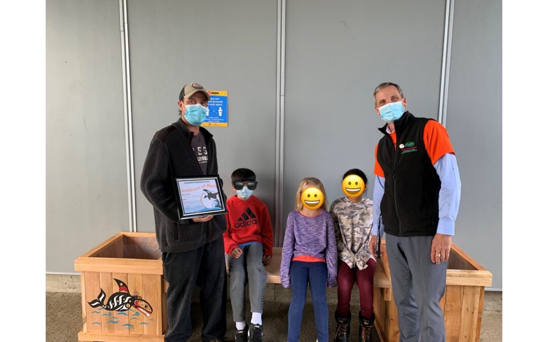 The bench is the work of Justin Hallworth. He asked Effrey Webber, a descendant of the Musgwamagw Dzawada’enuxw First Nation, to paint an orca on one of the benches garden boxes. The cedar for the bench and boxes came from Comox Valley Timber Splitting and Dustin Evans. When Justin learned the bench was for Courtenay Elementary, he generously donated it to the school. He delivered the bench to the school earlier in the week where principal Albert Johnson presented Justin with a certificate recognizing his “outstanding generosity and community spirit.”